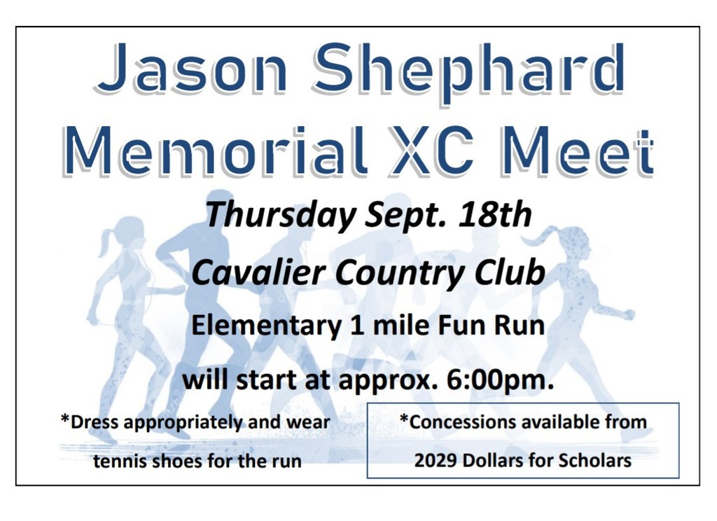 Elementary Fun Run. Starting line is near Hole #2’s tee box at Cavalier Country Club. Approximate 6:00pm start time.